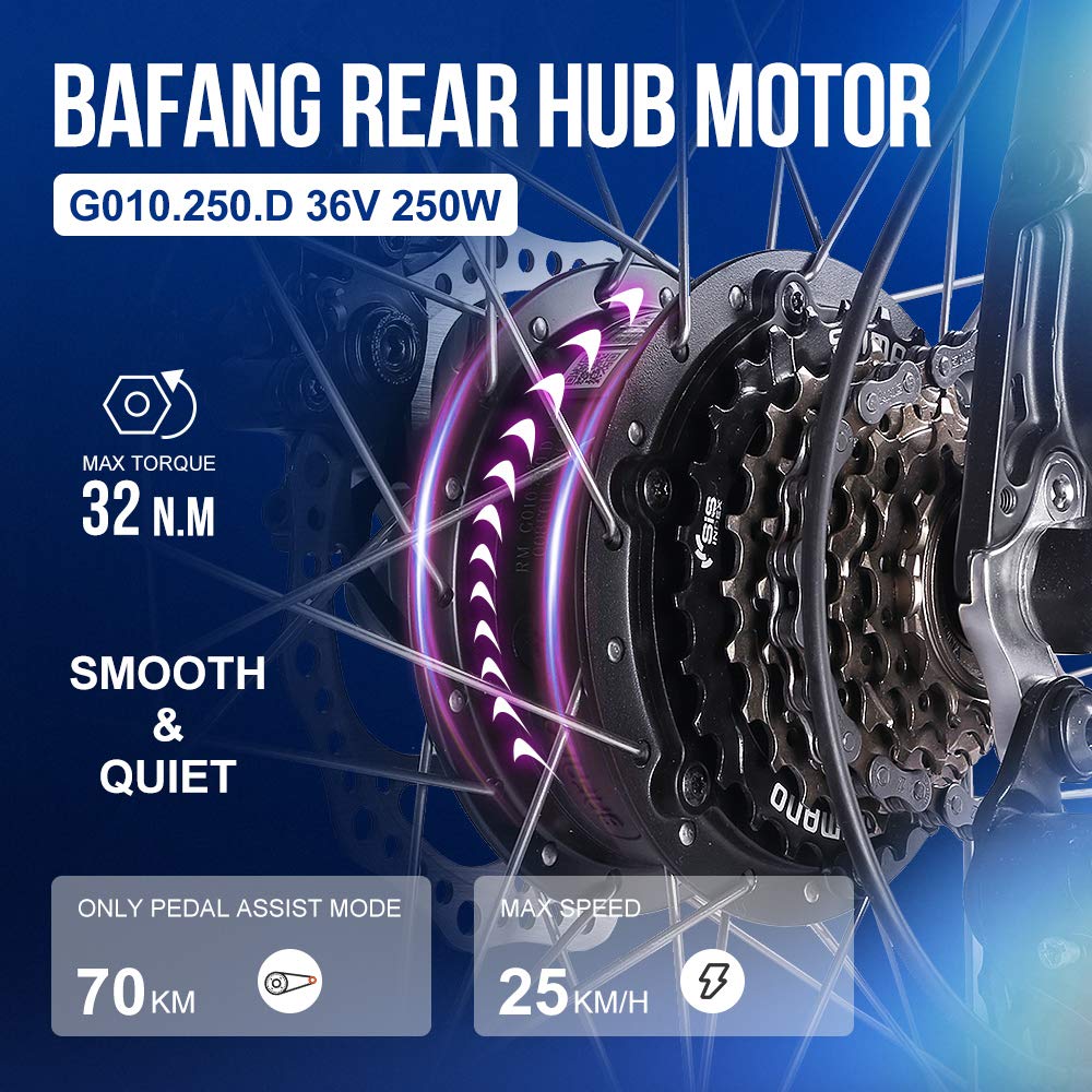 - Wydajny silnik i ukryty akumulator: ten silnik tylnej piasty BAFANG 250W 36V ze współczynnikiem redukcji 1: 4,42 i maksymalnym momentem obrotowym 32 Nm zapewnia idealną wydajność dla pojazdów. Ten mocny i wydajny silnik znacznie poprawia komfort jazdy i nadaje się do podróży turystycznych lub dojazdów do pracy. Wyposażony w ogniwa 36V 10,5Ah SAMSUNG 3500mAh. Czas ładowania: 5-6 godzin