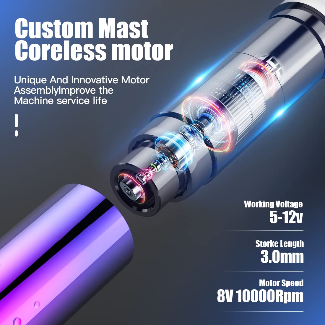 - Silnik niestandardowy: bezprzewodowy pisak do tatuażu używany z niestandardowym silnikiem bezrdzeniowym, 8 V/10000 obr./min, długość skoku: 3,0 mm.