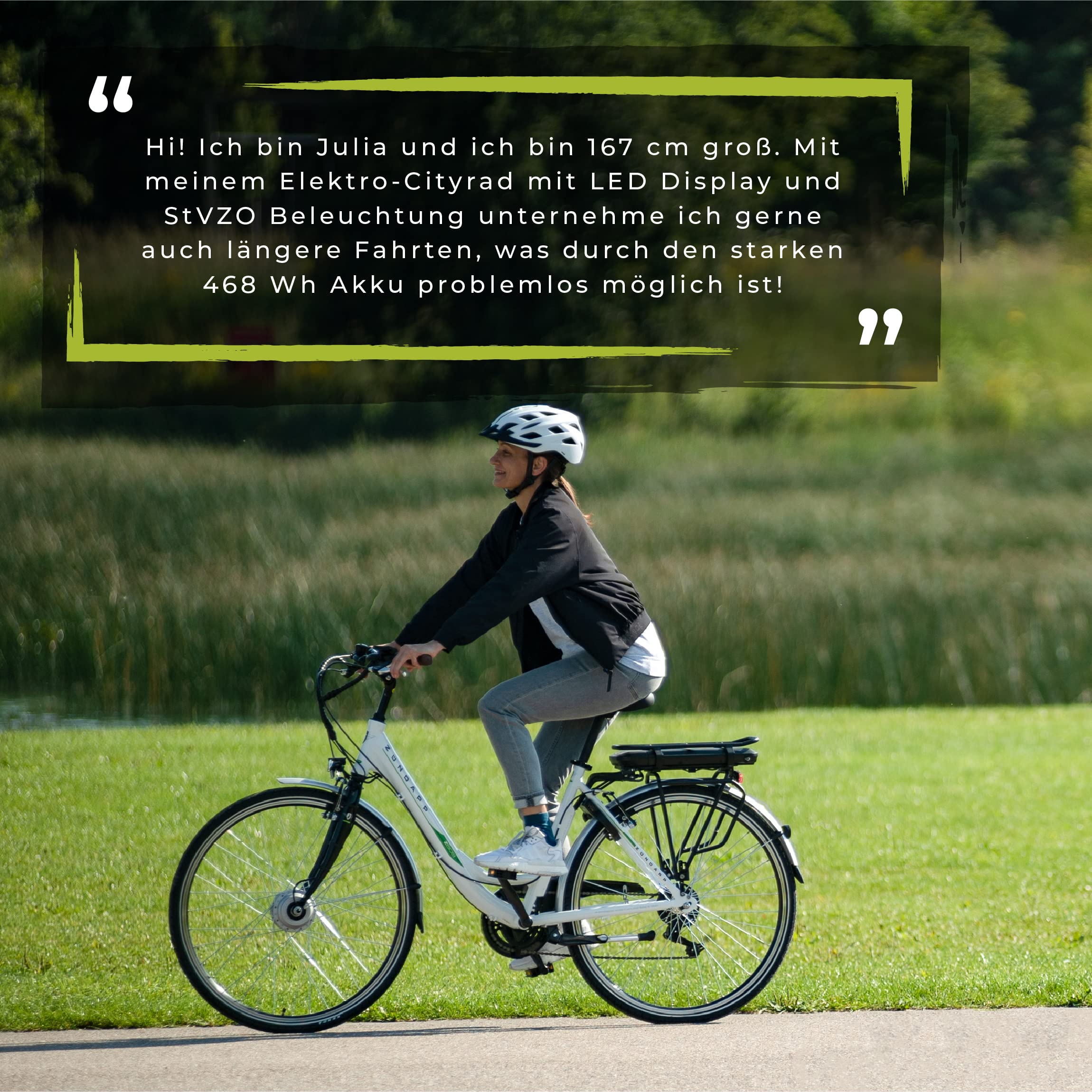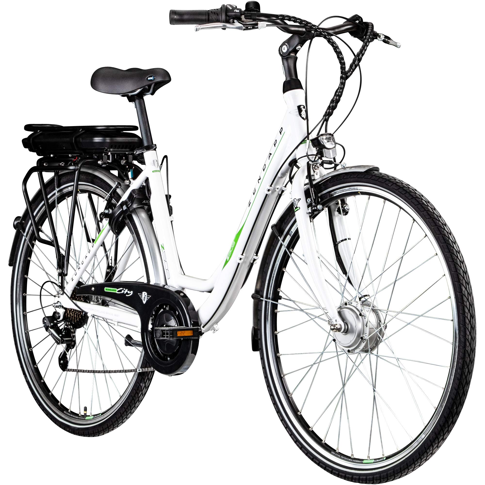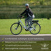 - W pełni wyposażenie: rower elektryczny jest wyposażony w oświetlenie zgodne z przepisami ruchu drogowego zgodnie z niemieckim prawem o ruchu drogowym, błotniki, osłonę łańcucha, stopkę boczną i bagażnik oraz hamulce Promax