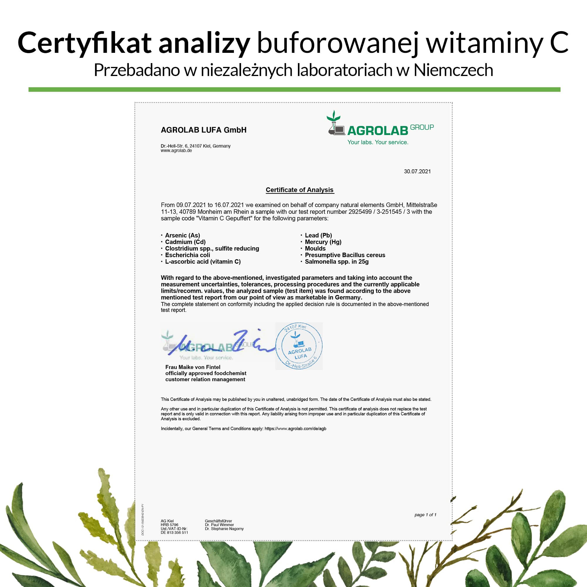 • PRZEBADANO W NIEZALEŻNYCH LABORATORIACH na zawartość witaminy C, metali ciężkich, pleśni, bakterii E.coli, salmonnelli i innych. Badanie zostało przeprowadzone przez niemieckie laboratorium akredytowane zgodnie z normą DIN EN ISO/IEC 17025. (Certyfikat analizy – patrz zdjęcia produktu)