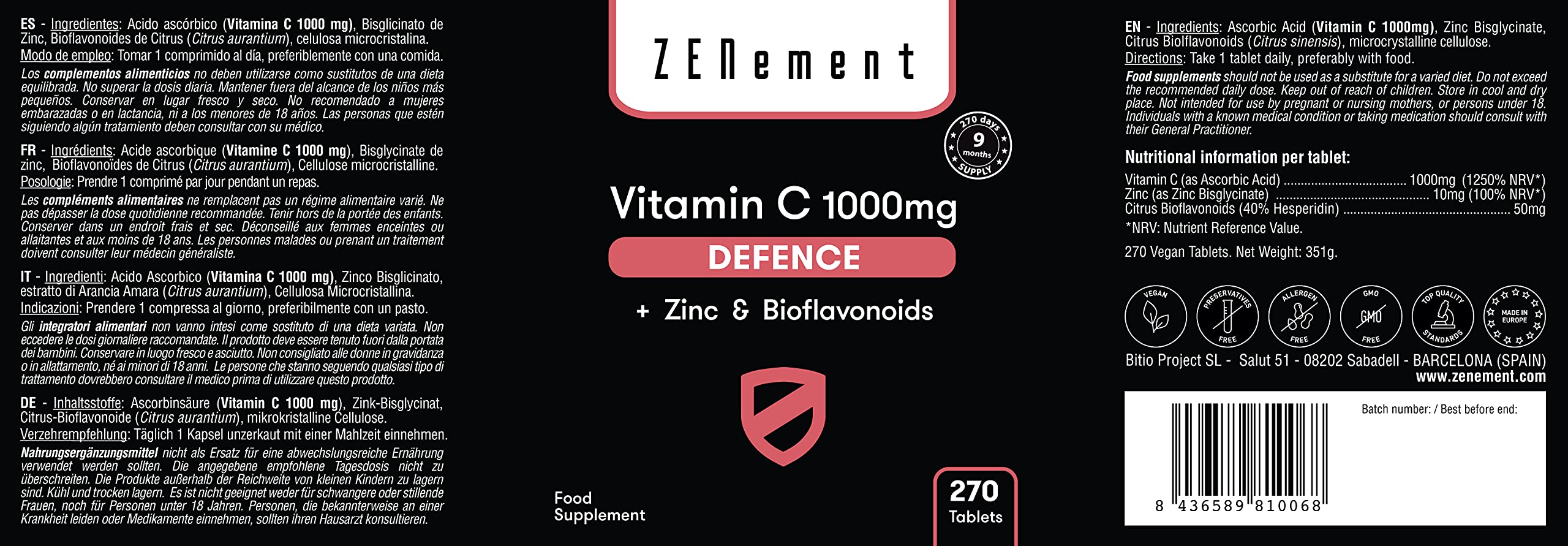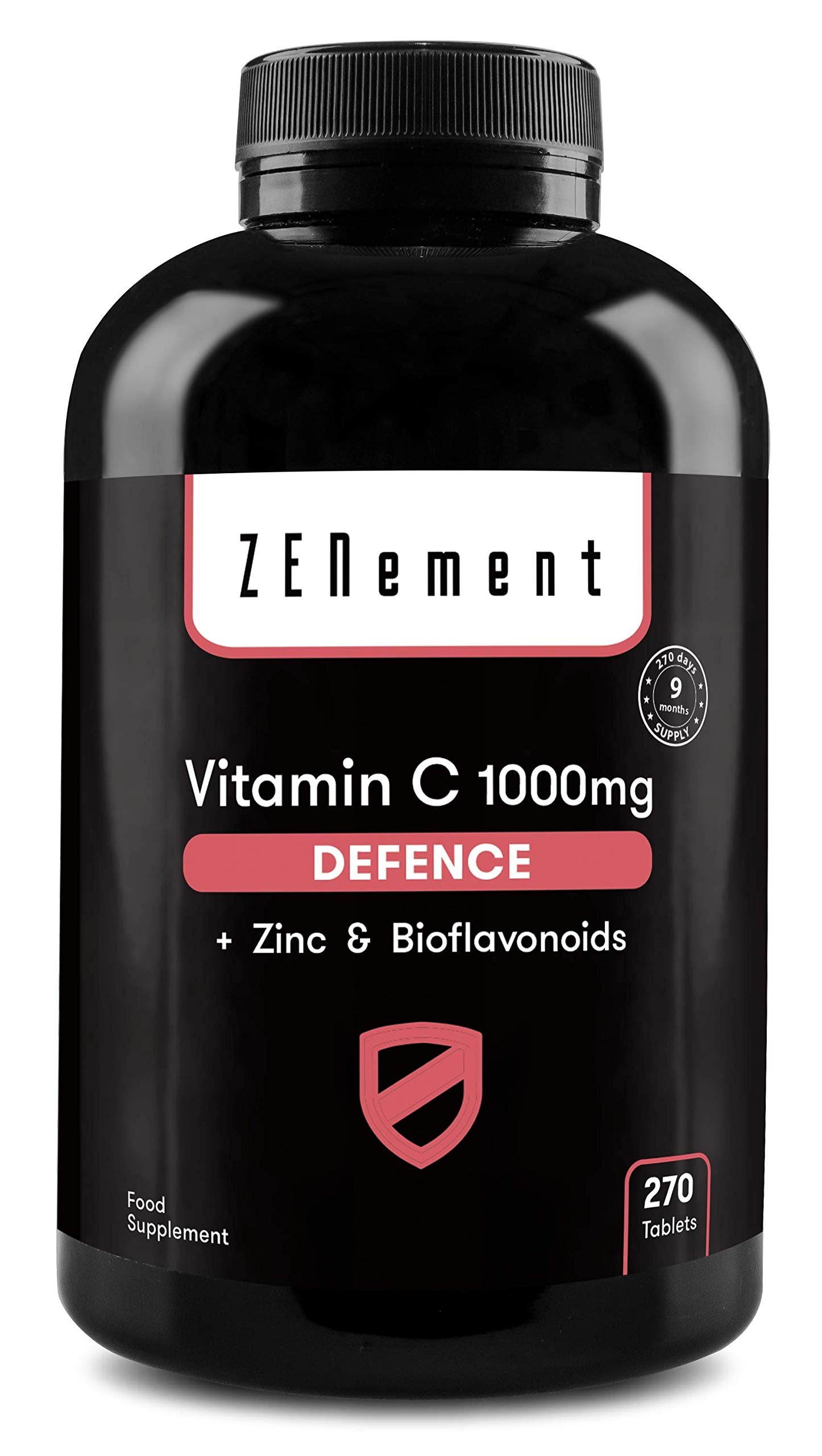 Witamina C Defence, z 1000 mg witaminy C + bioflawonoidy i cynk, 270 Tabletek | Wspiera układ odpornościowy i zmniejsza zmęczenie | Wegańska, bez dodatków, bez GMO, bez alergenów | od Zenement