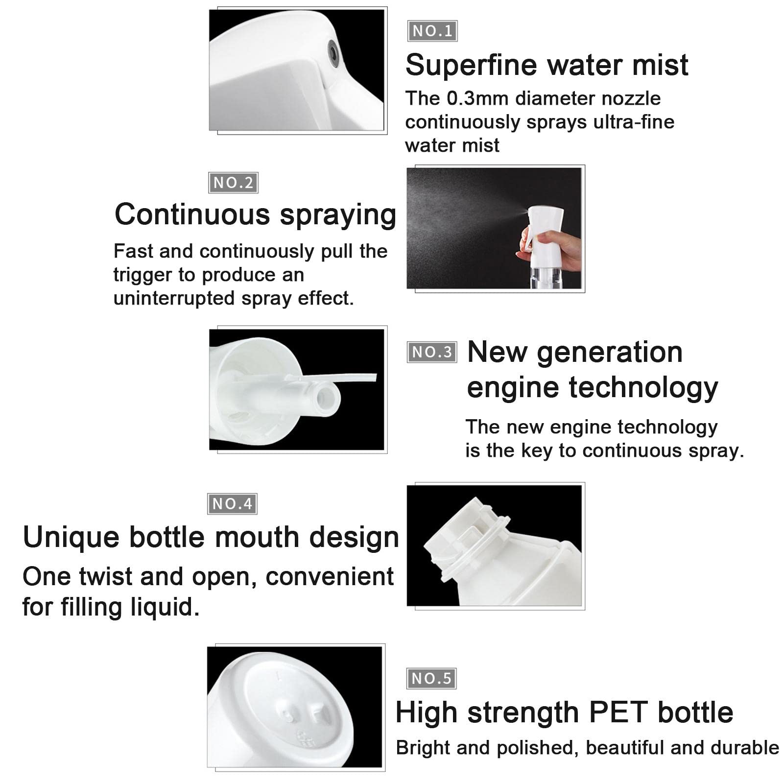- Nieprzemakalny design: The Continuous water mister empty spray jest wykonany z wysokiej jakości materiału PET, który jest wodoodporny dla długiego czasu. Ręcznie usuwane butelki z wieloma warstwami wodoodpornymi nakładkami. Podczas procesu usuwania bumy, zawartość butelki w sprayu nie może być pozostawiona nieprzeciekana.