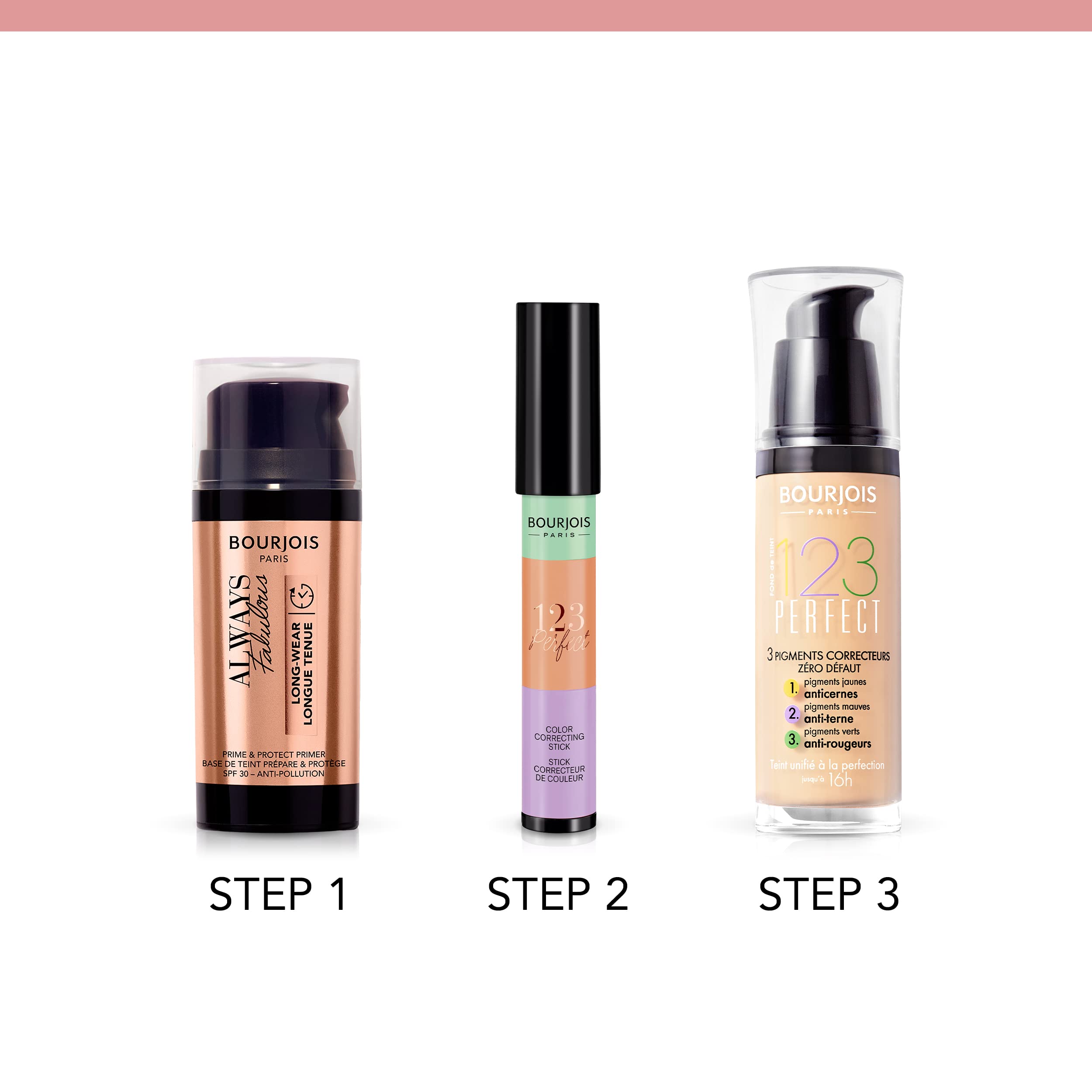 Wyrównaj koloryt skóry, by cieszyć się idealną cerą. Zacznij dzień z podkładem Bourjois 1,2,3 Perfect, aby cieszyć się nieskazitelną cerą i perfekcją, która trwa aż do 16 godzin. Jego innowacyjna formuła zawiera 3 pigmenty korygujące, które perfekcyjnie maskują niedoskonałości skóry: (1) Żółte pigmenty maskują cienie pod oczami i nadają cerze wypoczęty wygląd; (2) Fioletoworóżowe pigmenty korygują szary odcień skóry i nadają jej promienny wygląd; (3) Zielone pigmenty neutralizują zaczerwienienia, aby wyrównać koloryt cery. A zatem na co czekasz? Kiedy chcesz wyglądać olśniewająco przez cały dzień, podkład 1,2,3 Perfect bez problemu zadba o idealny wygląd Twojej cery, wyrównując koloryt skóry. Wymieszaj go palcami, aby uzyskać kryjący efekt bez smug, lub użyj gąbeczki, aby zapewnić olśniewający, lekki rezultat. Jedna warstwa zapewnia średnie pokrycie, ale możesz bez obaw nałożyć drugą. Dla nieskazitelnego, półmatowego efektu, który rozjaśni nawet najbardziej zmęczoną cerę, a w dodatku trwa, i trwa, i trwa… Podkład Bourjois 1,2,3 Perfect na pewno zasługuje na miejsce na Twojej liście najlepszych kosmetycznych trików.