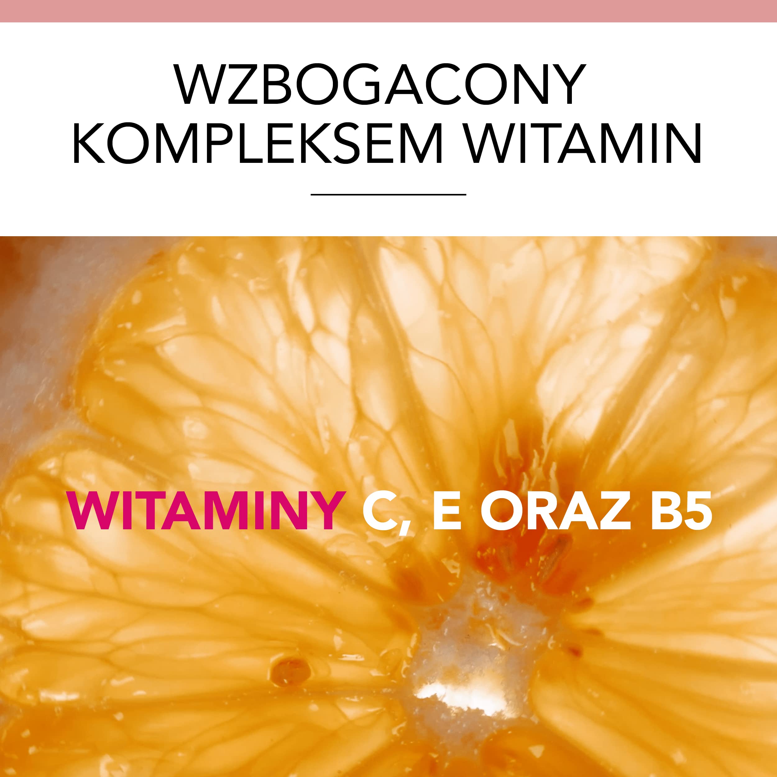 • Formuła z witaminami: witamina C- usuwa oznaki zmęczenia i odżywia skórę, witamina E -ma działanie antyoksydacyjne, witamina B5 - tonizuje skórę.