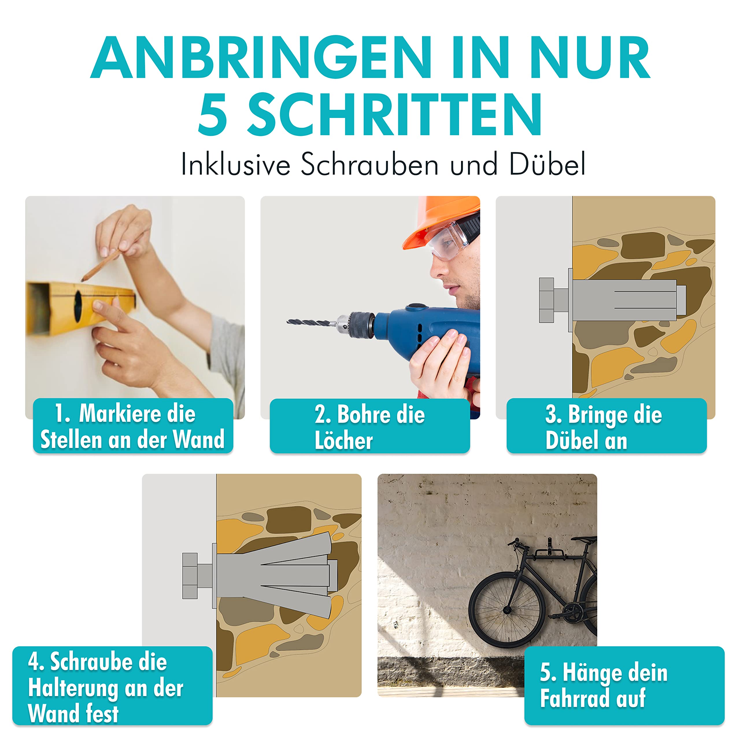 - Łatwa instalacja: Haczyk rowerowy jest łatwy w montażu w garażu, piwnicy lub mieszkaniu. Śruby instalacyjne są zawarte w produkcie, wystarczy wiertarkę i śrubokręt, aby zainstalować bagażnik rowerowy. Dodatkowa taśma do kół jest również dołączona, aby zapobiec obracaniu się koła.