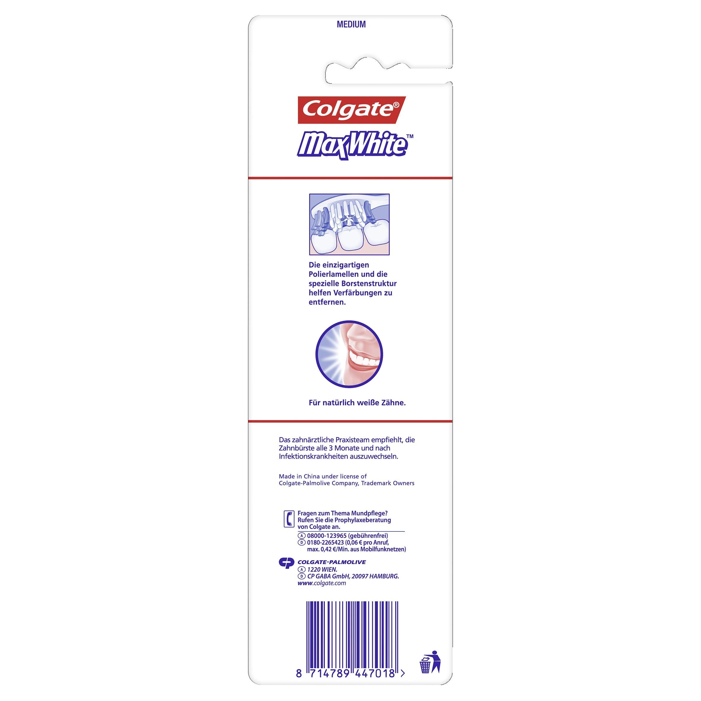 Colgate Szczoteczka do zębów Max White, średnia, 2 sztuki – ręczna szczoteczka do zębów do naturalnie białych zębów, ze średnio twardym włosiem