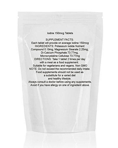 Tabletki jodowe 150 mcg składniki zasilające: Każda tabletka zapewni przeciętny zawartość jodu 150 mcg: Związek zawierający jodek potasu 0,19 mg, stearynian magnezu 2,25 mg, fosforan di¬wapnia 73,77 mg, celuloza mikrokrystaliczna 73,73,7 mg. 77 mg DI Reakcje: Weź 1 tabletkę 2 razy dziennie z posiłkiem jako suplement żywności. UWAGA: Nie należy przekraczać zalecanego dziennego spożycia. Suplementy żywnościowe nie powinny być stosowane jako zamiennik zróżnicowanej diety i zdrowego stylu życia. Należy unikać alergii na jeden ze składników powyżej. Odpowiedni dla wegetarian i wegan. Bez GMO