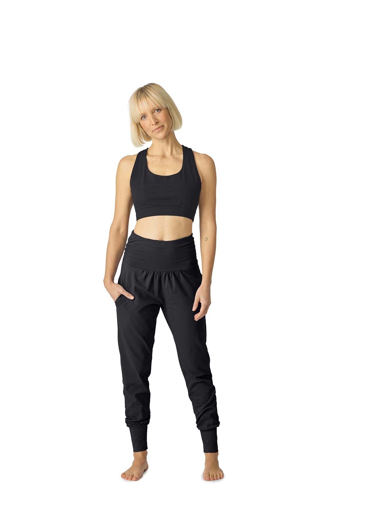 - Ekologiczne i trwałe – spodnie do jogi składają się w 96% z bawełny i 4% z elastanu. Produkcja naszych lekkich spodni materiałowych jest zatem bardzo przyjazna dla środowiska i odbywa się w uczciwych warunkach pracy.