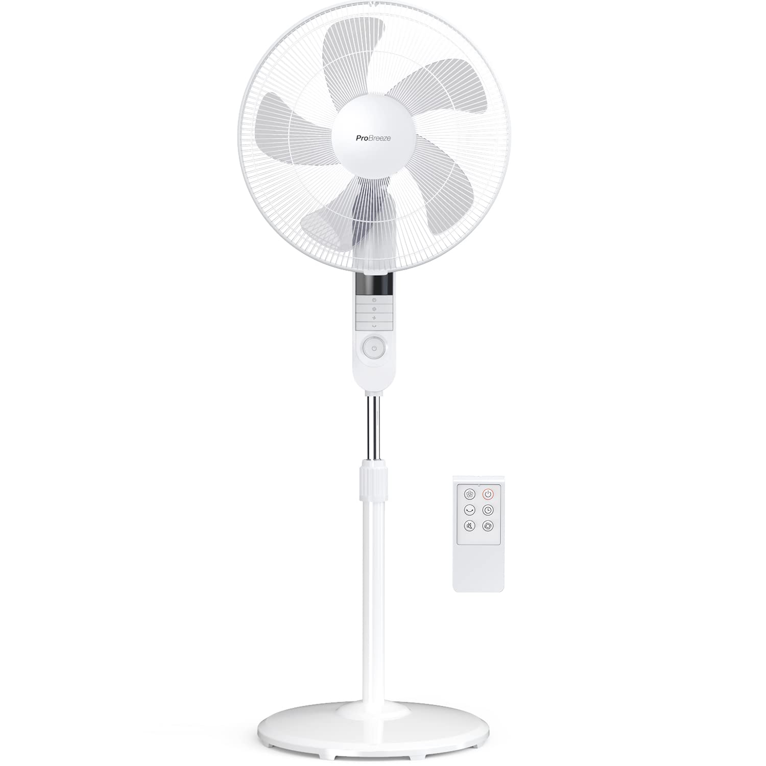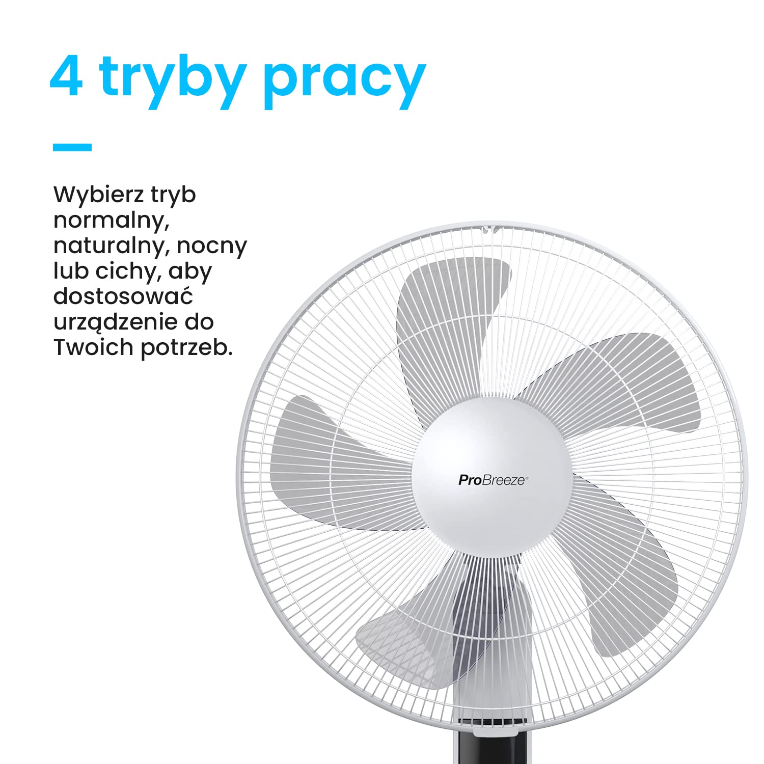Pro Breeze Wentylator Stojący z Pilotem Zdalnego Sterowania, Domowy Duży Pionowy Cichy Chłodzący Wiatrak Podłogowy Średnica 40cm, z Wyświetlaczem LED Oscylacją 80° i Regulacją, Silnik 55W, 3 Poziomy Prędkości, 4 Tryby Pracy, Biały