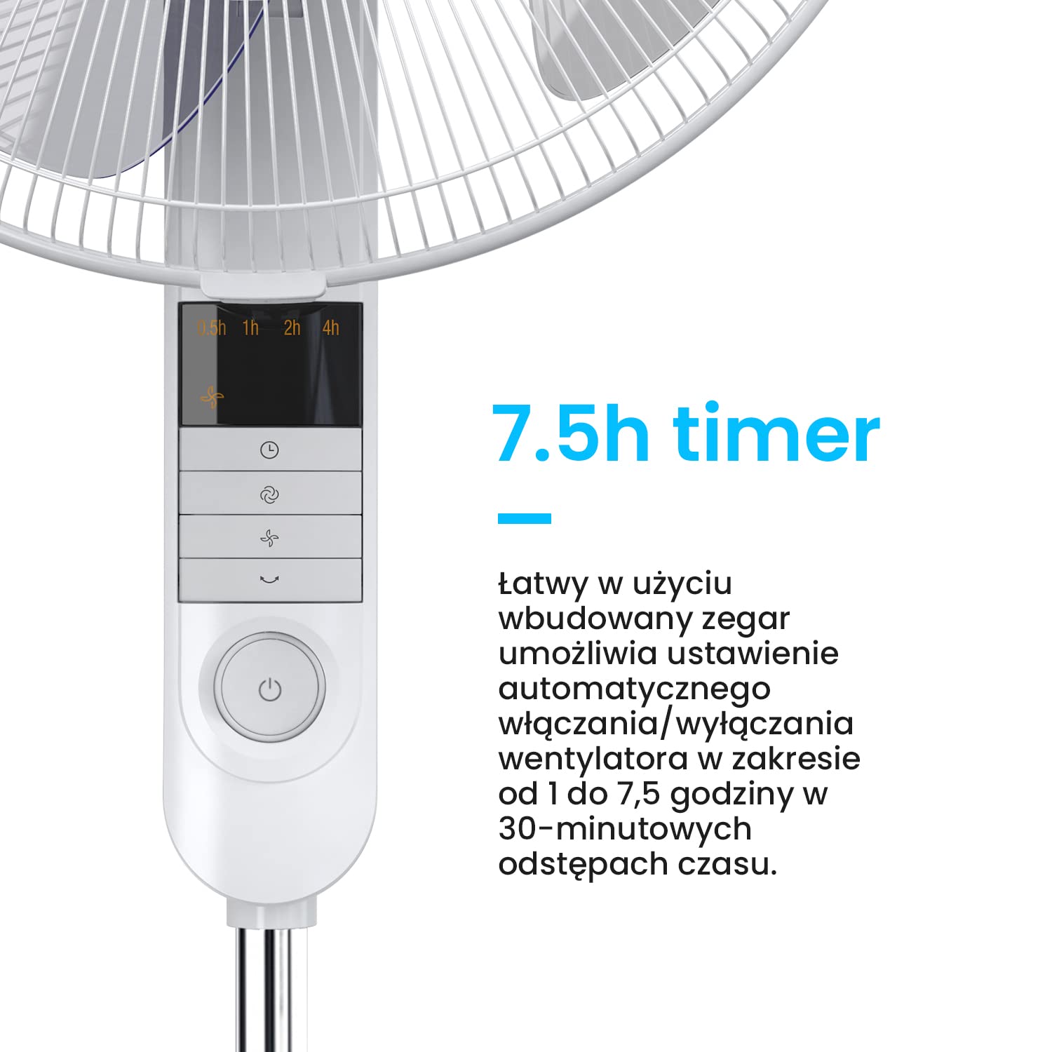 - 4 TRYBY PRACY I REGULACJA PRĘDKOŚCI- Nasz wentylator stojący posiada cztery tryby działania: chłodzący, naturalny, utra cichy i nocny oraz 3 poziomy prędkości. Wbudowany 7.5 godzinny regulator czasu umożliwi pełną kontrolę na czasem pracy wiatraka. Dzięki szerokiej gamie dostępnych opcji z łatwością dostosują Państwo urządzenie do swoich potrzeb.