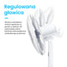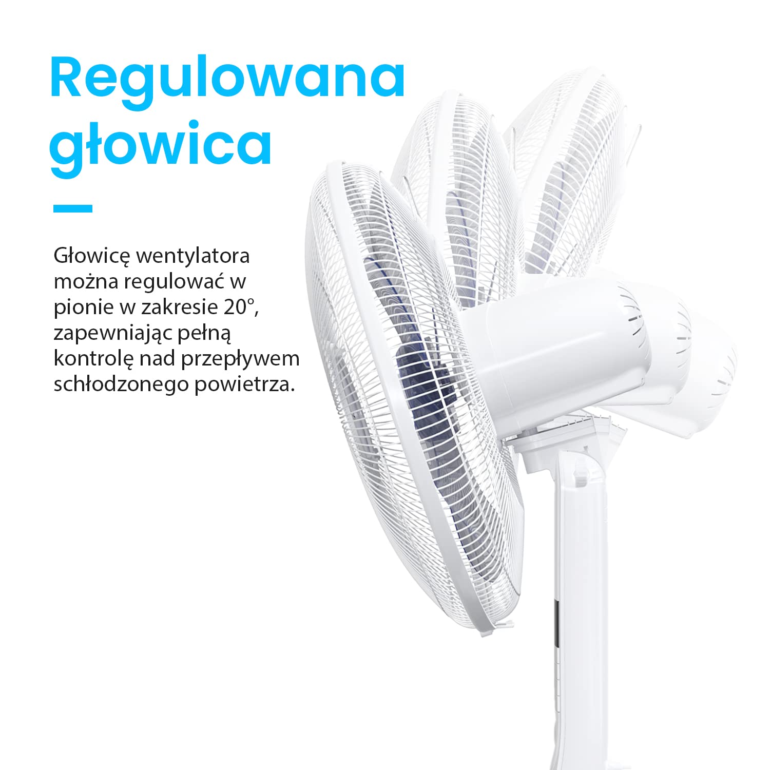 - 80° OSCYLACJA, RUCHOMA GŁOWICA- Głowica wiatraka porusza się ruchem oscylacyjnym w zakresie do 80° co pozwala na schłodzenie większej powierzchni pomieszczenia. Pionowa oś obrotu do 20°, zapewnia możliwość przekierowania powietrza w kierunku pionowym. Oba tryby gwarantują swobodę w regulacji kierunku schłodzonego strumienia powietrza.