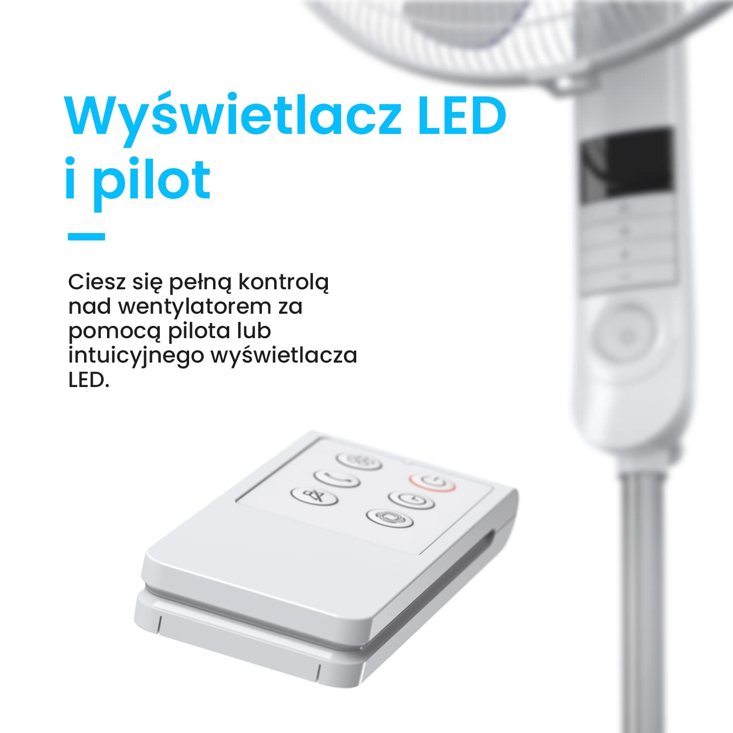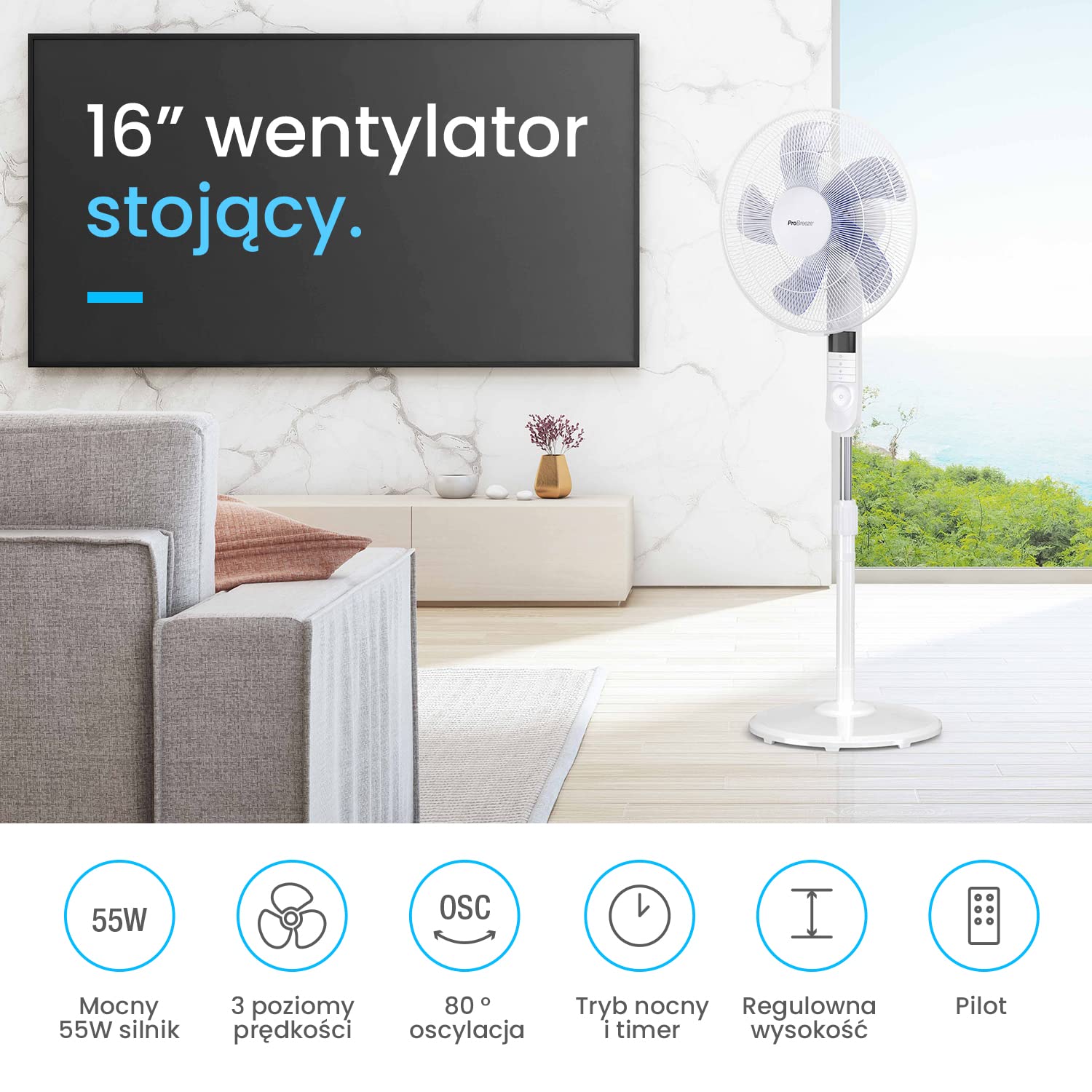 - DUŻY WIATRAK PODŁOGOWY- Przedstawiamy energooszczędny wentylator stojący Pro Breeze, o średnicy 40cm (16”). Nasz wiatrak wyposażony jest w czytelny ekran LED, który ułatwi kontrolę, a także pilot umożliwiający zdalne sterowanie urządzeniem. Okrągła podstawa pozwala na swobodne przemieszczanie urządzenia, a jego teleskopowa noga na dostosowanie wysokości w granicy od 115 do 135 cm.