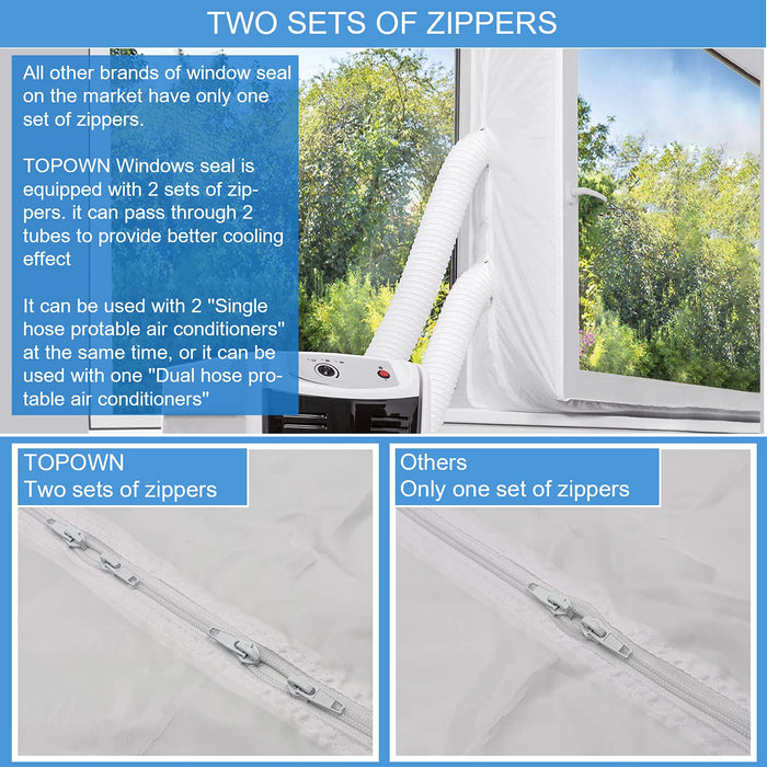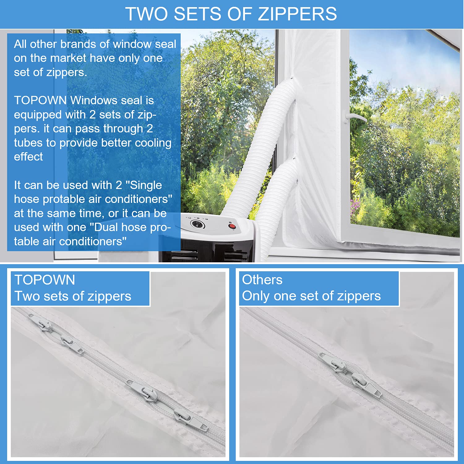 - Trwałe i uniwersalne – uszczelnienie okien marki TOPOWN jest wykonane z wysokiej jakości PVC z dwoma trwałymi zamkami błyskawicznymi YKK. Jest odporne na działanie promieni UV, wody i deszczu, odpowiednie do wszystkich przenośnych klimatyzatorów i suszarek wywiewowych oraz kompatybilne z różnymi oknami (okna skrzydłowe/ markizowe). Nadaje się do okien o obwodzie mniejszym niż 300 cm.