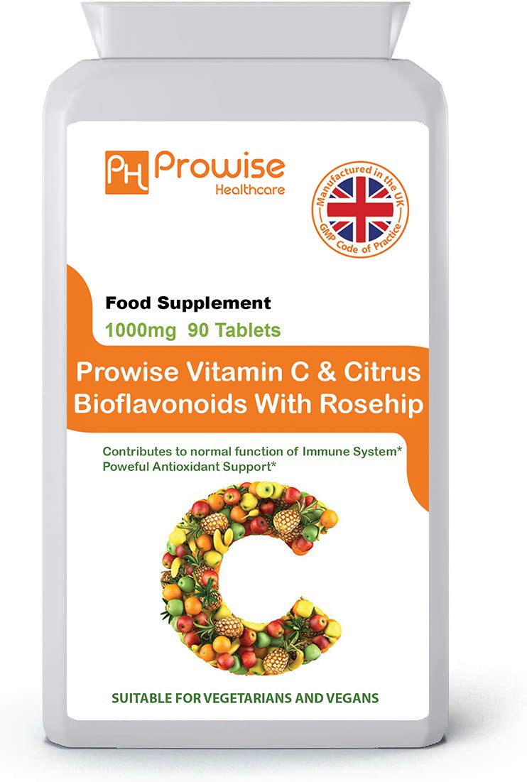 Witamina C 1000 mg z dzikiej róży i bioflawonoidami 90 wegańskich i wegetariańskich tabletek | przyczynia się do normalnego funkcjonowania układu odpornościowego - UK Manufactured | standardy GMP firmy Prowise Healthcare